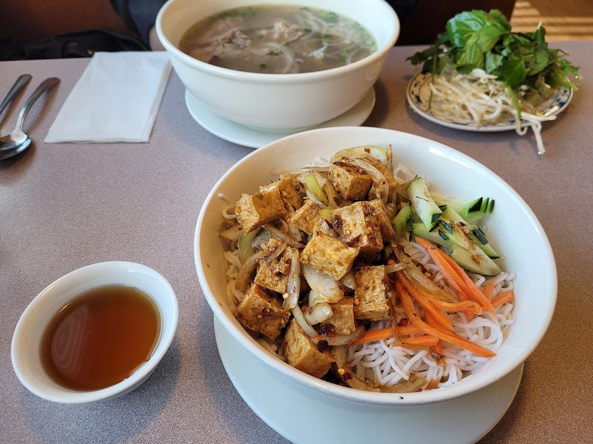 The menu showcases classic Vietnamese comfort dishes with a variety of options for meat-eaters and vegetarians alike. Specialties like Pho Tai and Nam (rare and well-done beef pho) and the Pho DAC Biet (special beef noodle soup) frequently draw locals looking for a hearty, warming bowl. Those preferring lighter choices often opt for fresh vegetable salad rolls with tofu or lemongrass tofu, which come highly regarded for their balance of flavor and freshness. Seafood and shrimp dishes offer straightforward lunch specials, making it a practical choice for a midday meal.